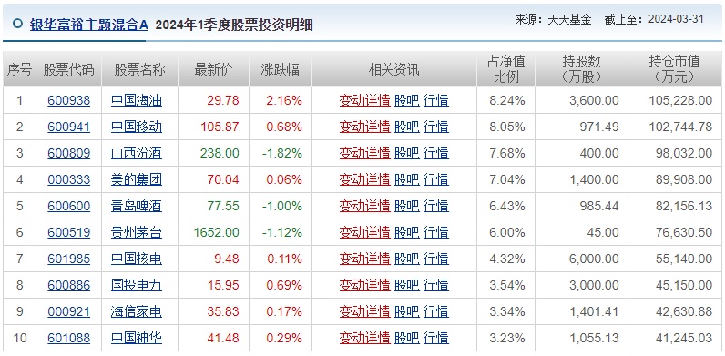 先来看焦巍管理时间最长的银华富裕主题混合A,在持仓变动方面,与2023年4季度相比,增持了中国海油(600938.SH)、中国移动(600941.SH)、美的集团(000333.SZ)等,减持了贵州茅台(600519.SH)、山西汾酒(600809.SH)、中国神华(601088.SH)等。