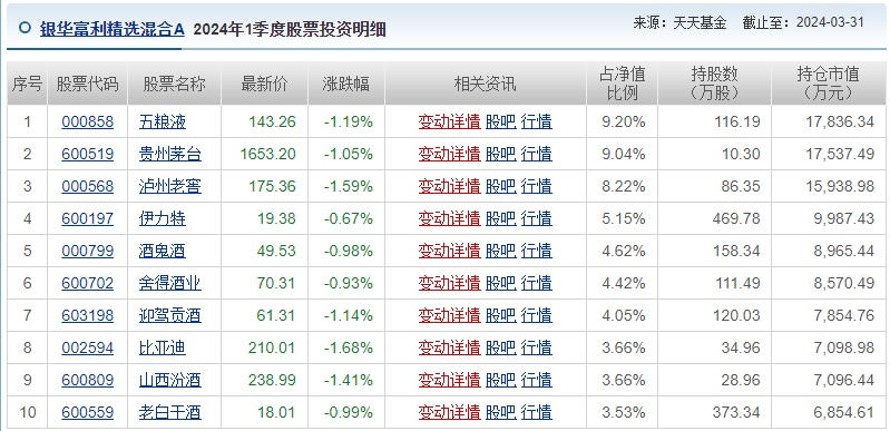 最后再看看银华富利精选混合,在持仓变动方面,与2023年4季度相比,五粮液跃升至第一大重仓股,贵州茅台则从第一回落至第二,但两者的持股数并无太大变化。迎驾贡酒得到了大量增持,持股数由95.47万股升至120.03万股,持股比例由3.08%升至4.05%。值得注意的是,比亚迪(002594.SZ)、山西汾酒成为该基金的新进十大重仓股,益丰药房(603939.SH)和同仁堂(600085.SH)则退出了十大重仓股行列。