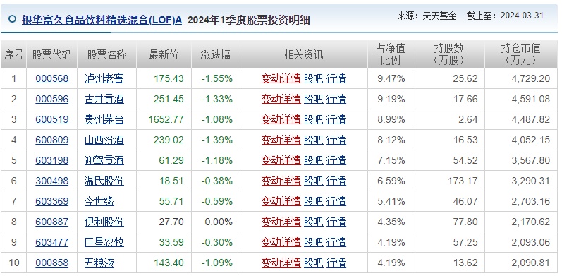 再来看看银华富久食品饮料精选混合,在持仓变动方面,与2023年4季度相比,增持了温氏股份(300498.SZ)等,减持了贵州茅台、山西汾酒、迎驾贡酒(603198.SH)等。五粮液(000858.SZ)、伊利股份(600887.SH)成为该基金的新进十大重仓股,唐人神(002567.SZ)与天康生物(002100.SZ)则退出了十大重仓股行列。值得注意的是,温氏股份得到大量增持,持股数由98.23万股增至173.17万股,持股比例跃升至6.59%。