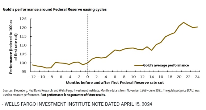 富国银行投资研究所分析师在4月15日的一份报告中表示,如果美联储对美国通胀持续降至2%的年度目标有信心,它可能会在今年晚些时候降息,这已经“不是什么秘密”。但“不那么为人所知的是,过去一些黄金最强劲的表现是在美联储降息周期期间出现的”。