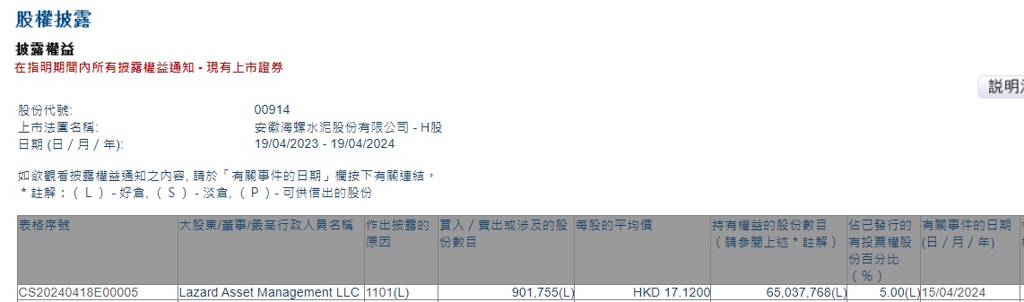 智通财经APP获悉,香港联交所最新资料显示,4月15日,Lazard Asset Management LLC增持海螺水泥(00914)90.1755万股,每股作价17.12港元,总金额约为1543.80万港元。增持后最新持股数目约为6503.78万股,最新持股比例为5%。