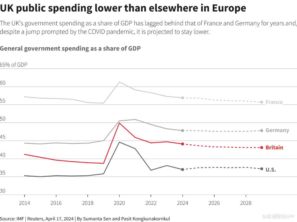 虽然英国的公共支出占经济产出的比例高于美国,但却低于德国和法国,这给医疗和教育等服务造成了压力。
