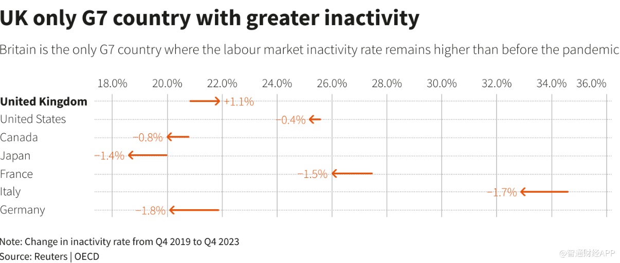 英国是七国集团中唯一一个适龄劳动人口退出劳动力市场的比例高于疫情前的国家,这减缓了经济增长,推高了通胀。