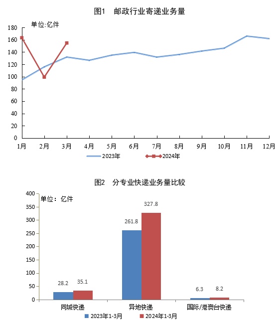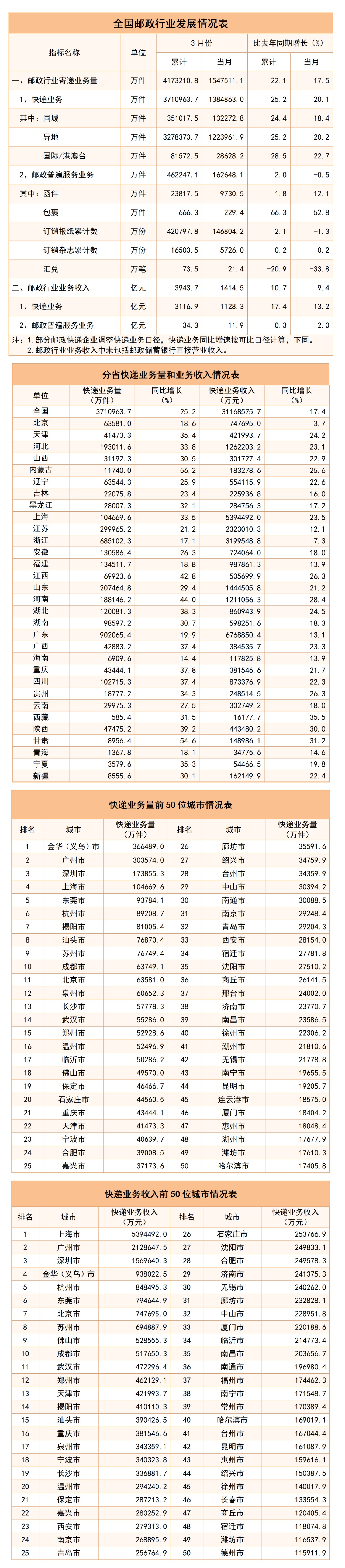3月份,邮政行业寄递业务量完成154.8亿件,同比增长17.5%。其中,快递业务量完成138.5亿件,同比增长20.1%。