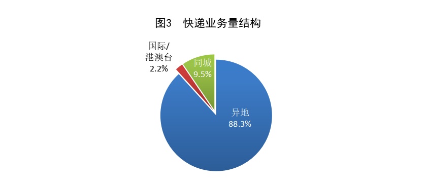 一季度,同城、异地、国际/港澳台快递业务量分别占全部快递业务量的9.5%、88.3%和2.2%。与去年同期相比,同城快递业务量的比重下降0.1个百分点,异地快递业务量的比重基本保持一致,国际/港澳台业务量的比重上升0.1个百分点。