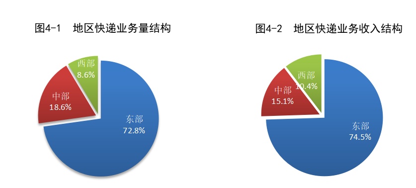 一季度,东、中、西部地区快递业务量比重分别为72.8%、18.6%和8.6%,业务收入比重分别为74.5%、15.1%和10.4%。与去年同期相比,东部地区快递业务量比重下降2.2个百分点,快递业务收入比重下降1.2个百分点;中部地区快递业务量比重上升1.4个百分点,快递业务收入比重上升0.7个百分点;西部地区快递业务量比重上升0.8个百分点,快递业务收入比重上升0.5个百分点。