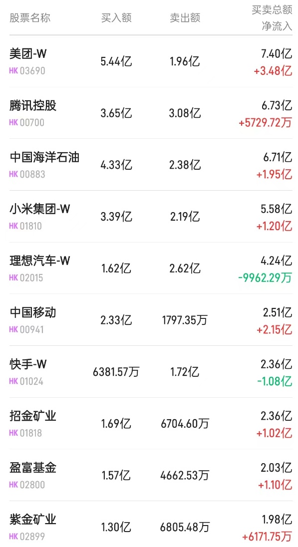 此外,小米集团-W(01810)、美团-W(03690)、盈富基金(02800)分别获净买入3.08亿、1.46亿、1.1亿港元。