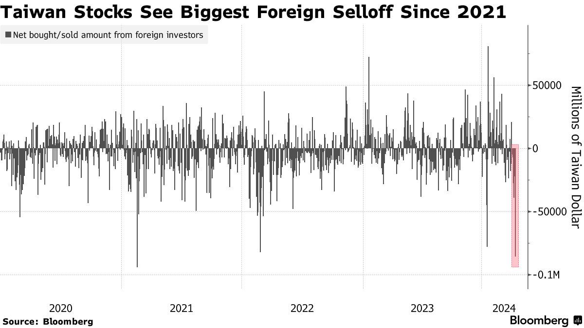 智通财经APP获悉,海外投资者周五从中国台湾股市撤出858亿新台币(约合26亿美元),这是三年多以来最大规模的海外资金流出,原因是重量级企业台积电下调前景展望,以及全球市场疲弱影响了市场人气。数据显示,以科技股为主的台湾基准股指下跌3.8%,创2022年10月以来的最大跌幅。