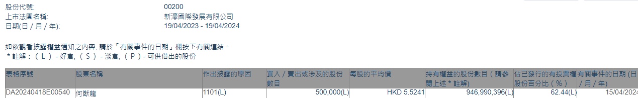 智通财经APP获悉,联交所最新资料显示,4月15日,集团主席何猷龙增持新濠国际发展(00200)50万股,每股作价5.5241港元,总金额约为276.21万港元。增持后持股数目为9.47亿股,持股比例为62.44%。