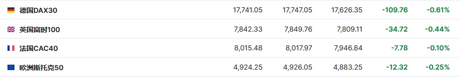 2. 截至发稿,德国DAX指数跌0.61%,英国富时100指数跌0.44%,法国CAC40指数跌0.10%,欧洲斯托克50指数跌0.25%。