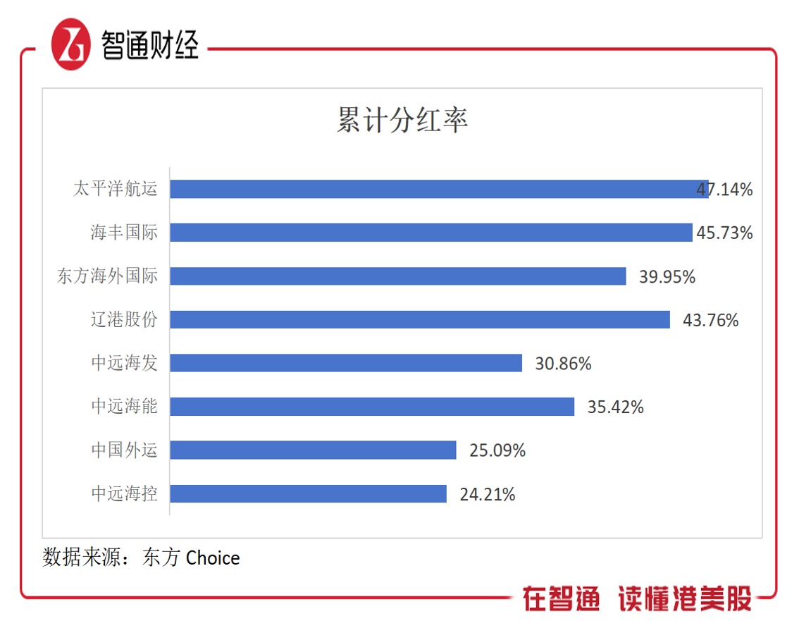 值得注意的是,即便业绩下滑,航运板块派息依然非常稳健,在派息率上,2023年,中远海控15.53%、中国外运24.84%、中远海能49.83%以及太平洋航运34.73%等,平均派息率超过30%,从累计分红表现看,板块平均派息率为36.5%,其中太平洋航运及海丰国际最高,分别为47.14%及45.73%。