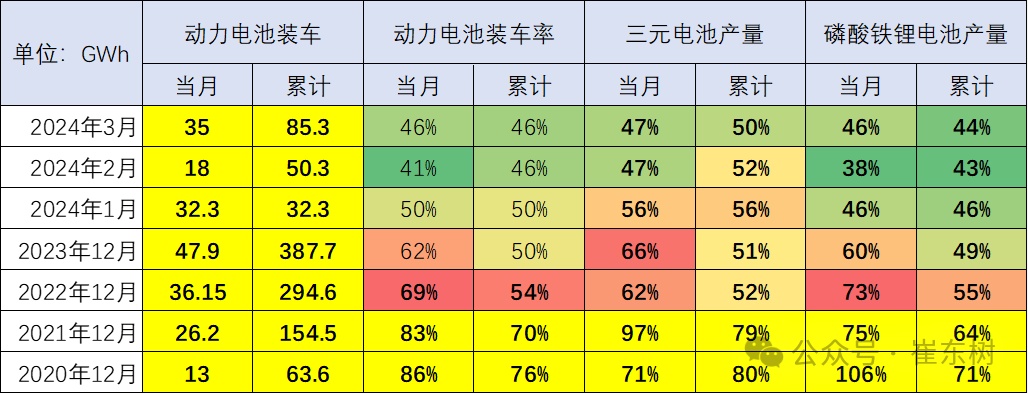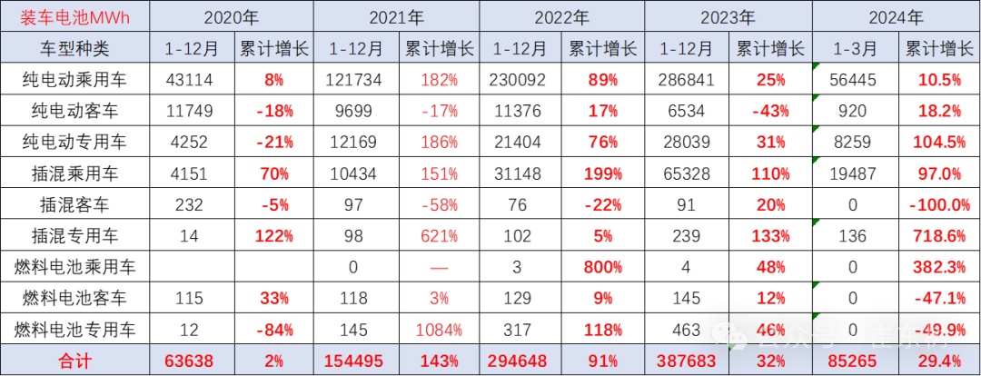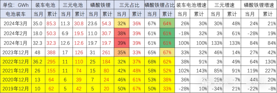 2024年3月的锂电池装车35 GWh,同比增26%。三元电池装车11.3GWh,占比32%,持平同期;而磷酸铁锂电池装车量23.6GWh,占比67%,三元电池增长有所改善。1-3月锂电池装车85G,同比增长30%。