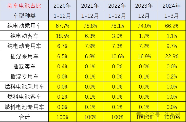 目前来看,纯电动客车从18.5%下降到2024年累计的1.1%的水平,下降了17个百分点。插电混动乘用车的电池用量增长相对比较迅猛,目前已经从7%上升到22.9%的水平,增加16%,而纯电动下降到66%,保持乘用车占比90%以上的绝对核心的电池需求特征。