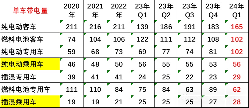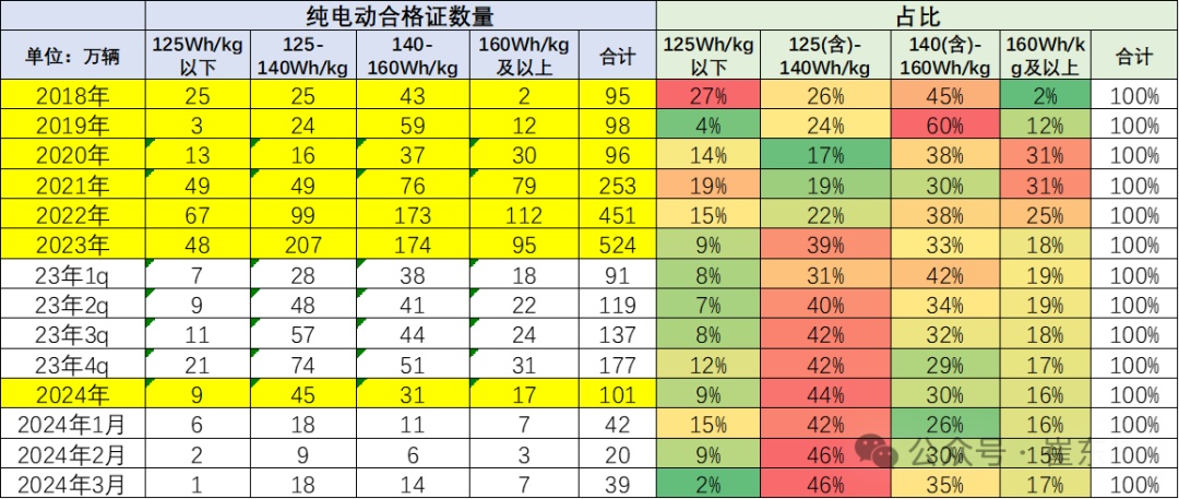 2024年1-3月的电池能量密度160以上的车型占比17%,相对于2023年的19%出现了明显的下降,这主要还是磷酸铁锂电池对三元替代带来的能量密度下降。而125以下的能量密度的产品从2023年9%下降到了目前2024年的9%的比例,3月降到2%。