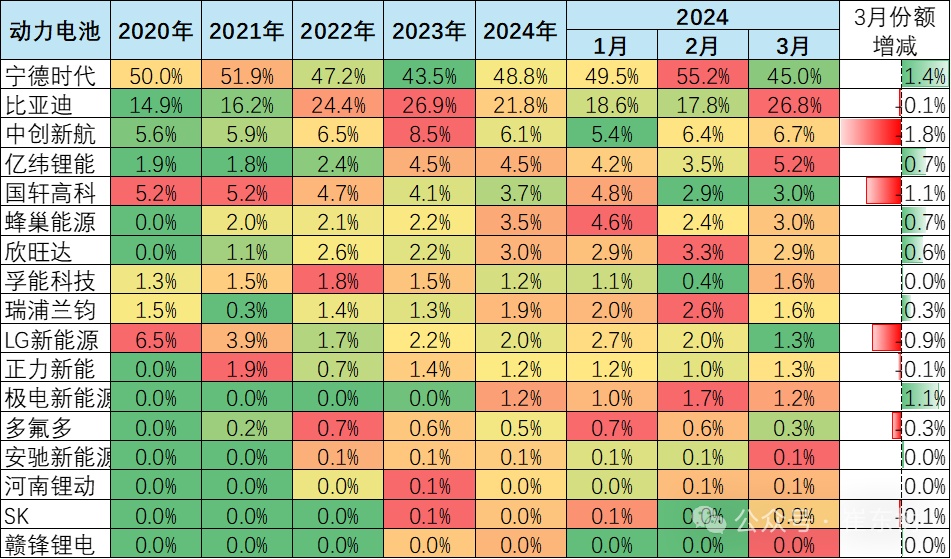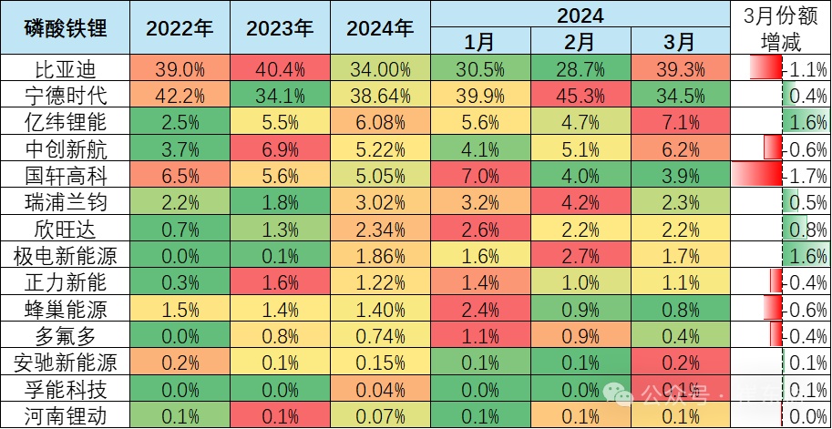 磷酸铁锂电池的产品差异优势明显。比亚迪相对优秀,但今年年初进入调整期。宁德时代的铁锂电池的占比份额从今年1-2月已经反超比亚迪,3月比亚迪开始发力恢复。亿纬锂能、欣旺达、极点新能源的提升明显。