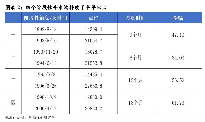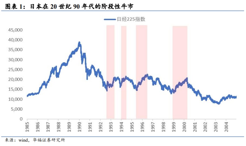 20世纪90年代,日本经济在泡沫破裂后陷入了长期的衰退,被称为“失去的十年”。这十年日本经济增长显著放缓,资产价格大幅下跌,银行系统也因大量不良贷款而陷入危机。但回顾日本泡沫经济破灭后的资本市场,可以发现仍有4次年度或半年度级别的牛市,分别是:1992/8-1993/5、1993/11-1994/6、1995/7-1996/6和1998/10-2000/4,涨幅都较为可观,分别为47.1%、34%、56.5%和61.7%。从国际上指数涨幅超过20%构成“技术性牛市”的标准来看,这四次涨幅都不算小。