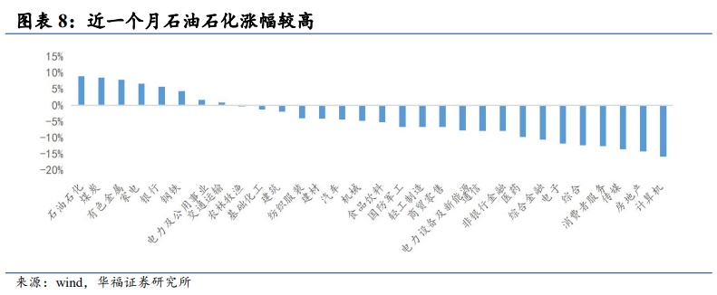整体来看,近一个月石油石化表现出色。近一个月,石油石化表现出色,其次为煤炭、有色金属等。近期出口、大宗商品以及消费板块均能观察到景气复苏的迹象,以上三大方向构成了“轻复苏”的投资主题,随着A股业绩的披露,有望引领新一轮行情,以上投资方向值得关注。