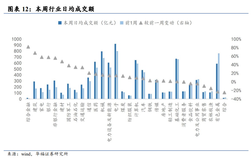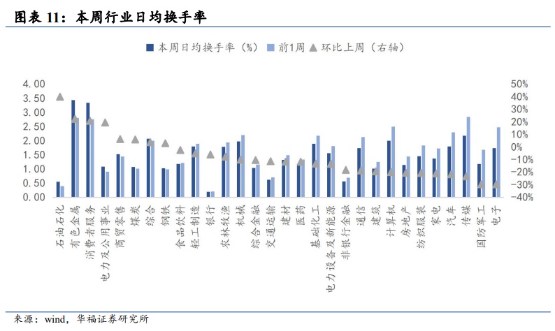 从行业角度来看,本周石油石化板块成交情况出现明显改善。从成交活跃度改善情况来看,石油石化最为明显,本周日均换手率、日均成交额环比上周分别增长40%、35%,反映出行业关注度的提升。