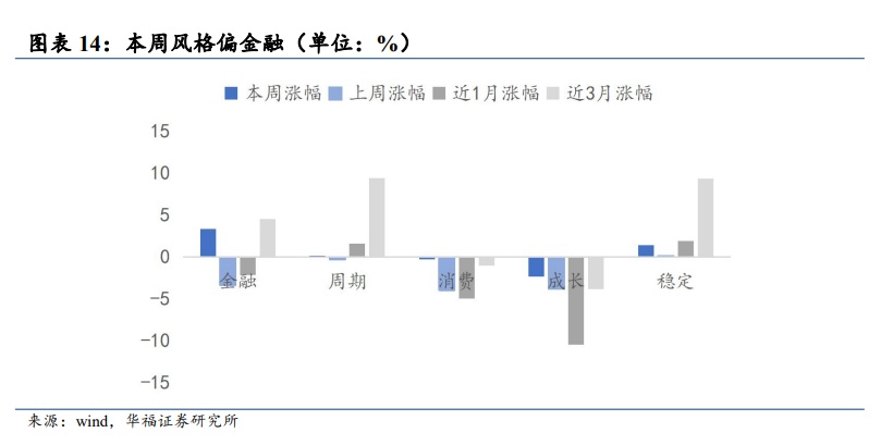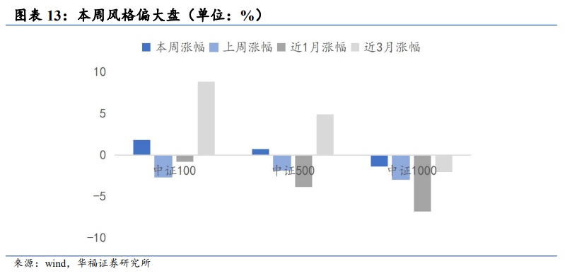 本周风格偏大盘与金融。从规模来看,大盘指数表现优于中盘指数及小盘指数;从中信风格分类来看,金融风格领先于其他风格。