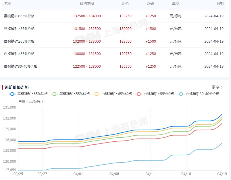 智通财经APP获悉,近期,钨价持续走高,创近十年新高。据上海有色网数据,4月19日,黑钨精矿价较上一日上涨1250元/吨,最新报价为13.325万元-13.4万元/吨。中信证券认为,由于国内外新建项目较少且短期增量十分有限,钨资源供应或将持续紧张,叠加下游制造业复苏带来的需求回暖,供给短缺将会对钨价形成坚挺支撑,钨价或将强势上涨至18-20万元/吨。