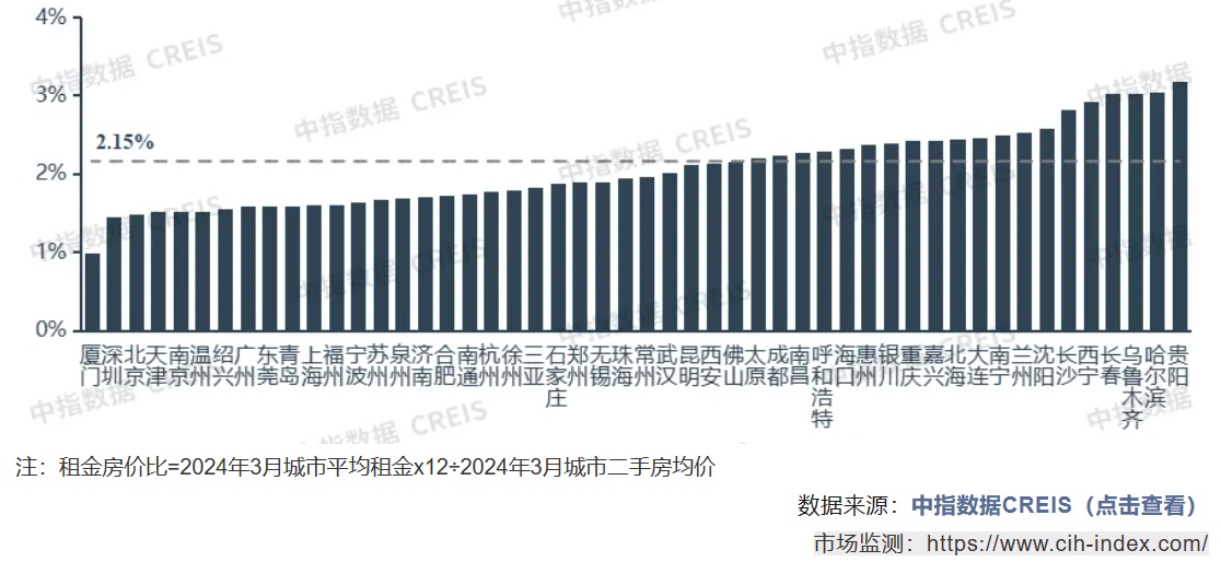 根据中指监测数据,2024年3月,50个重点城市租金房价比平均为2.15%,处于较低水平。50城中,26个城市租金房价比低于2.0%。厦门租金房价比仅为1.0%,深圳、北京、南京等核心一二线城市房价较高,租金房价比相应较低,在1.5%左右。