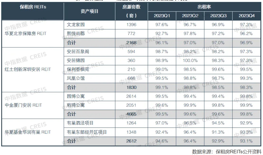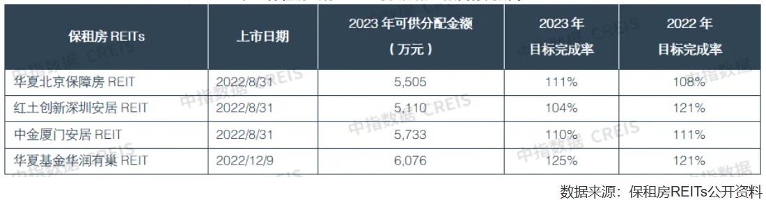 2.保租房REITs:2023年保租房REITs可供分配金额目标完成率均超100%,底层资产项目出租率均处高位