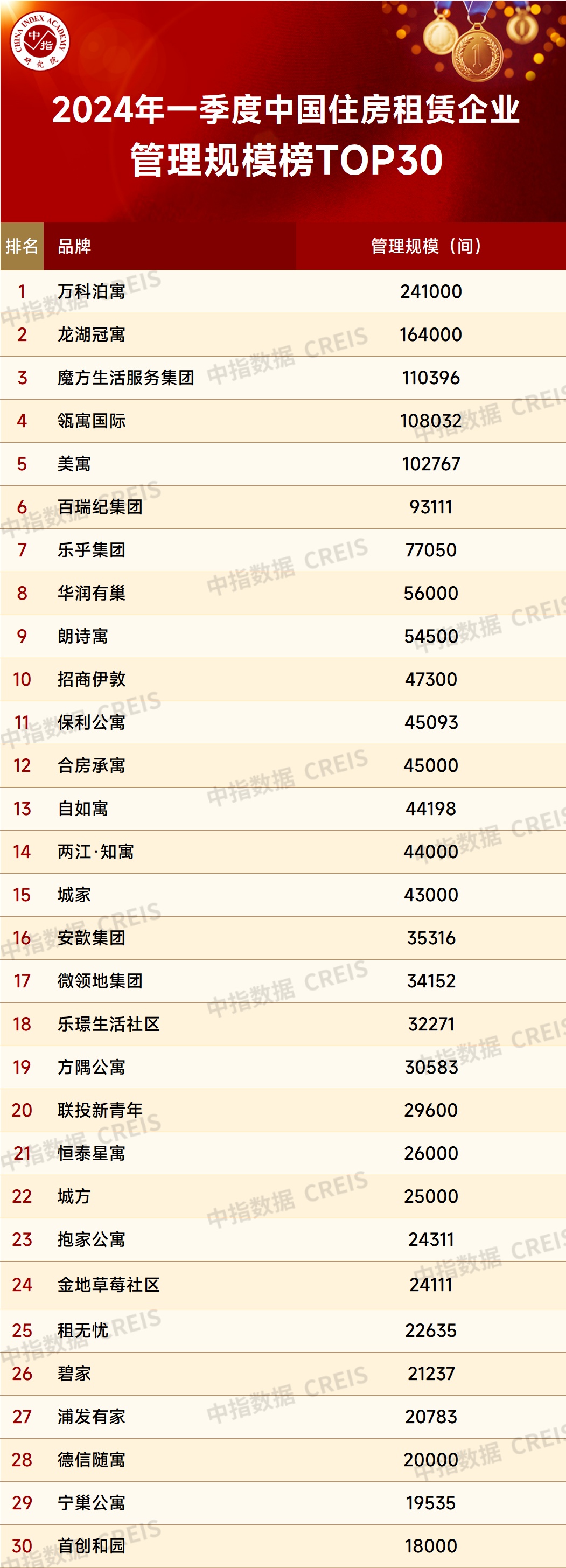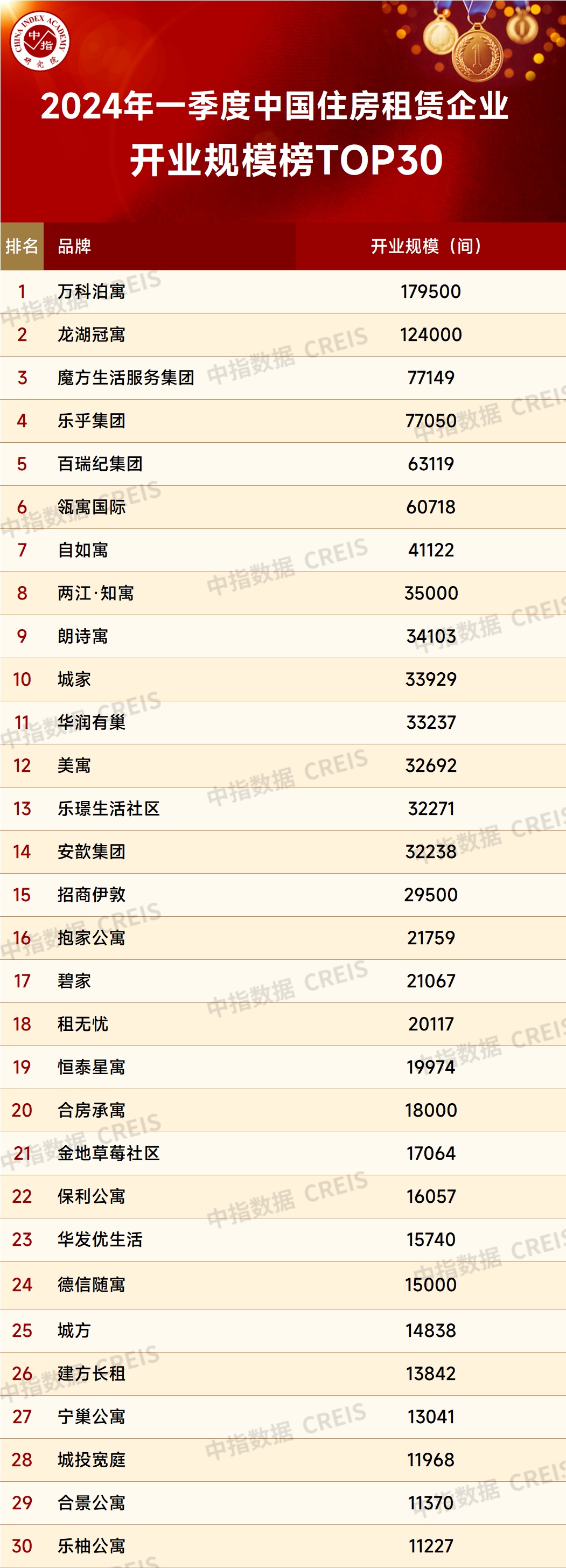 据中指研究院统计,截至2024年一季度末,TOP30集中式长租公寓企业累计开业房源量达112.7万间,较2023年四季度末增加4.1万间。其中,TOP5企业累计开业规模达52.1万间,较上季度末增加0.4万间,占TOP30总规模比重为46.2%,较上季度末下降1.3个百分点。2024年一季度末,开业规模TOP30入榜门槛为11227间,较上季度末提升1527间。