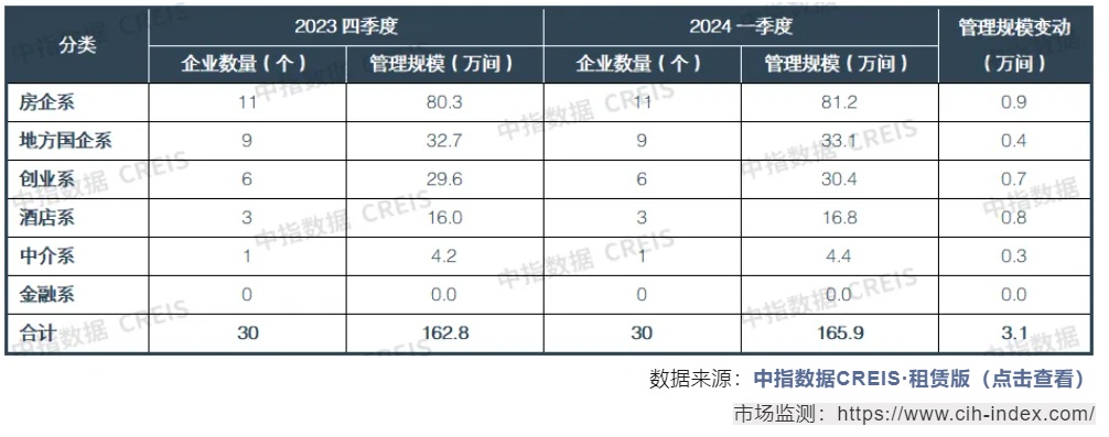 分类来看,管理榜TOP30中,分别有11家房企系住房租赁企业、9家地方国企系、6家创业系、3家酒店系、1家中介系,结构较上季度末未发生变化。从管理规模变动来看,房企系、酒店系和创业系增量较大,分别为0.9万间、0.8万间和0.7万间。