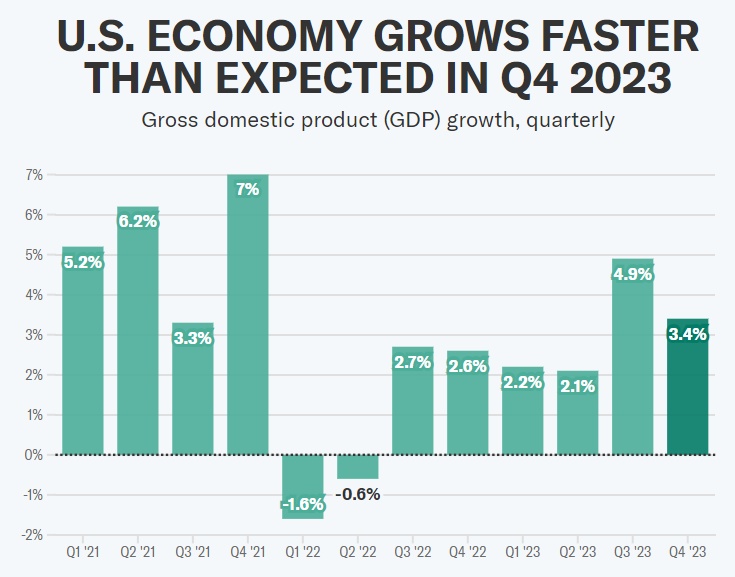 投资者对美联储降息的重新定价基本泰然自若,部分原因是经济背景越来越积极。在整个第一季度,经济学家一直在提高他们对经济增长的预测。经济学家预计,美国经济第一季度的年化增长率为2.5%,低于2023年第四季度的3.4%,但仍高于潜在增速1.8%。