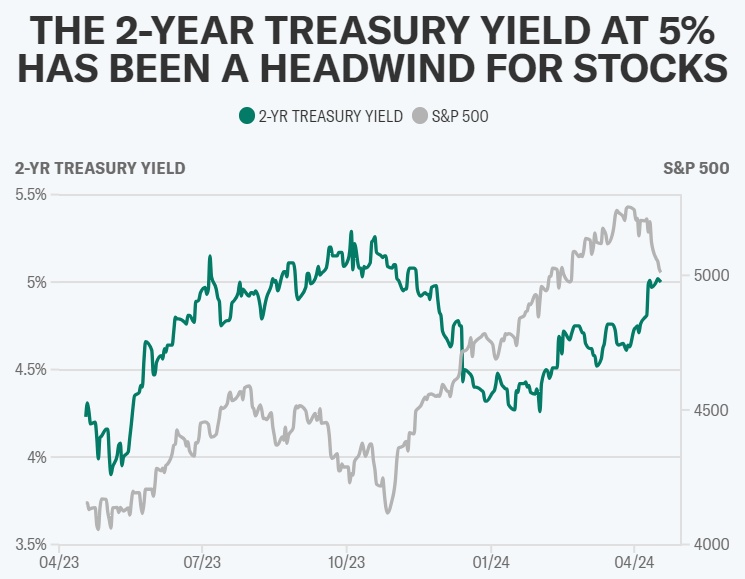 投资者将密切关注本周的经济数据,看其可能如何改变债券收益率上升的走势。债券收益率上升正再次成为投资者的痛点。上周二,2年期美国国债收益率飙升至5%,这是自2023年10月股市最近一次触底以来首次达到该水平。美联储主席鲍威尔上周表示,通胀率下降到2%的目标需要“比预期更长的时间”。
