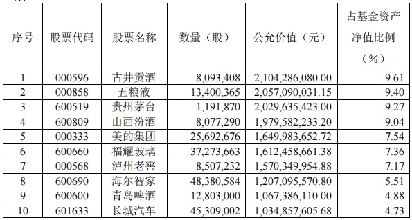 重仓股方面,截至一季度末,易方达消费行业的前十大重仓股分别是:古井贡酒(000596.SZ)、五粮液(000858.SZ)、贵州茅台(600519.SH)、山西汾酒(600809.SH)、美的集团(000333.SZ)、福耀玻璃(600660.SH)、泸州老窖(000568.SZ)、海尔智家(600690.SH)、青岛啤酒(600600.SH)、长城汽车(601633.SH)。与2023年四季度末相比,前十大重仓股标的没有变化,持股数量有所变化。