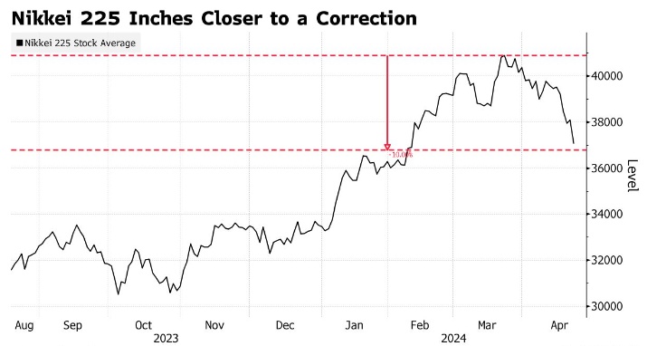 日本股市在今年早些时候飙升至历史高点后,已接近技术性回调,原因是交易员大幅削减了对美联储降息的押注。这刺激美元再度走强,并令日元承压,美元兑日元已升至近155。这一水平引发了人们对日本当局可能进行干预的担忧,并引发了华尔街券商的警告,目前地缘政治压力不断加剧,促使投资者纷纷避险。