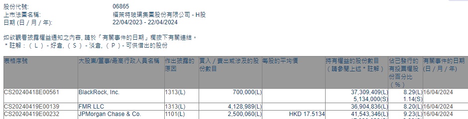 智通财经APP获悉,香港联交所最新资料显示,4月16日,摩根大通增持福莱特玻璃(06865)250.006万股,每股作价17.5134港元,总金额约4378.46万港元。增持后最新持股数目4154.3346万股,最新持股比例为9.23%。