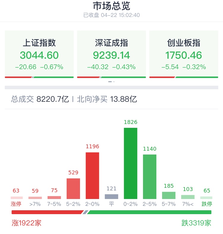 4月22日,A股冲高回落,沪指领跌。盘面上,军工板块逆势掀涨停潮,旅游、养殖、白酒等大消费板块反弹,脑机接口等医药股表现活跃;下跌方面,资源股熄火,煤炭、石油重挫,AI赛道集体下挫,低空经济等板块跌幅居前。