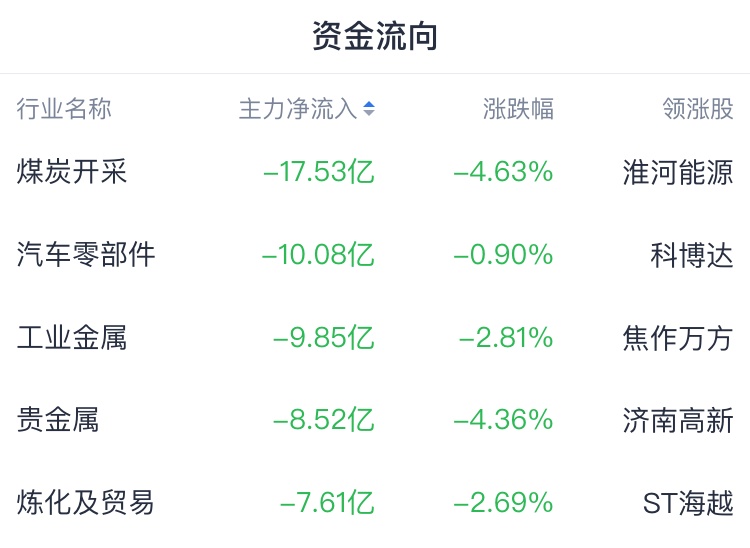 主力资金方面,资金出逃煤炭、汽车零部件、工业金属等行业;资金青睐军工电子、白酒、光伏等行业。