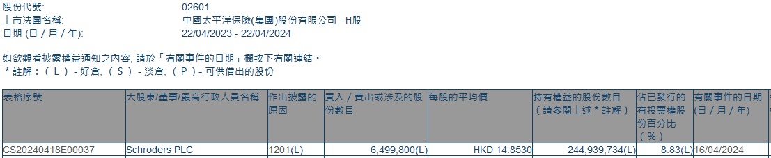 智通财经APP获悉,香港联交所最新资料显示,4月16日,Schroders PLC减持中国太保(02601)649.98万股,每股作价14.8530港元,总金额约为9654.15万港元。减持后最新持股数目约为2.45亿股,最新持股比例为8.83%。