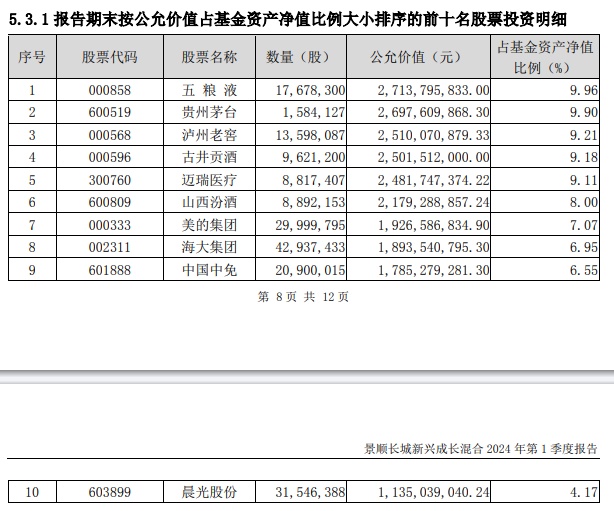 一季度,景顺长城新兴成长A的前十大重仓股分别为五粮液、贵州茅台、泸州老窖、古井贡酒、迈瑞医疗、山西汾酒、美的集团、海大集团、中国中免和晨光股份。