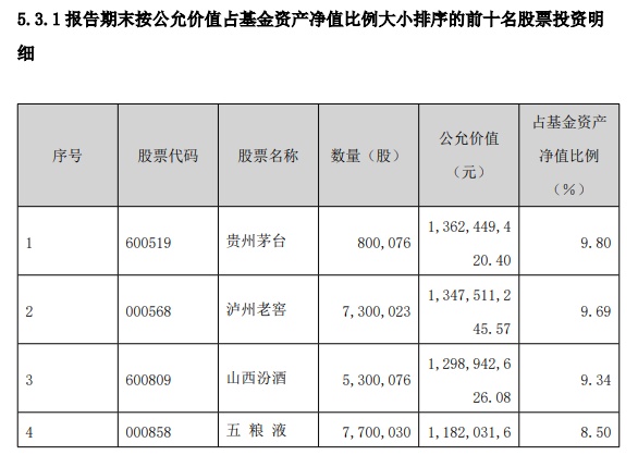 报告期内,汇添富消费行业前十大重仓股包括贵州茅台(600519.SH)、泸州老窖(000568.SZ)、山西汾酒(600809.SH)、五粮液(000858.SZ)、海尔智家(600690.SH)、古井贡酒(000596.SZ)、今世缘(603369.SH)、安井食品(603345.SH)、迎驾贡酒(603198.SH)、美的集团(000333.SZ)。