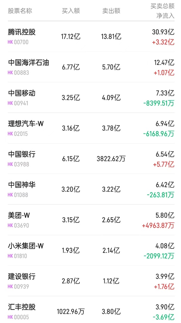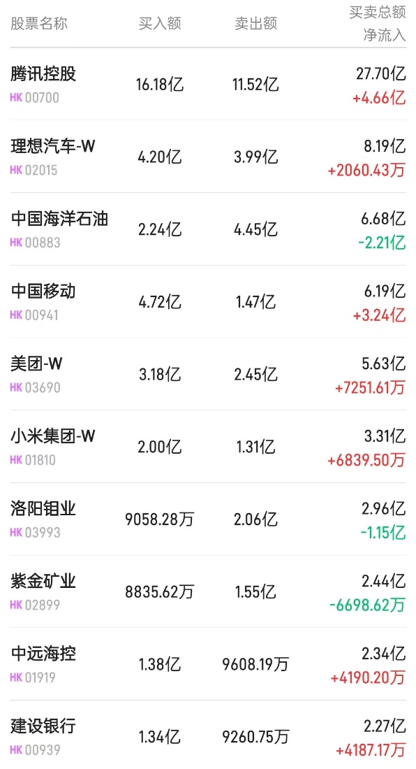北水净买入最多的个股是腾讯(00700)、中国银行(03988)、中国移动(00941)。北水净卖出最多的个股是汇丰控股(00005)、洛阳钼业(03993)、中海油(00883)。