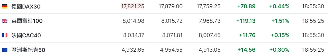 2. 截至发稿,德国DAX指数涨0.44%,英国富时100指数涨1.51%,法国CAC40指数涨0.15%,欧洲斯托克50指数涨0.30%。
