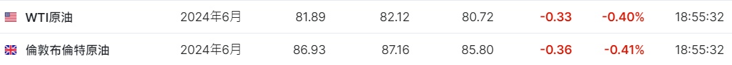 3. 截至发稿,WTI原油跌0.40%,报81.89美元/桶。布伦特原油跌0.41%,报86.93美元/桶。