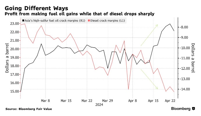与此同时,根据Bloomberg Fair Value的数据,在需求方面,高硫燃料油(主要由中硫品级生产)的利润率有所上升,而亚洲生产柴油的利润却有所下降。