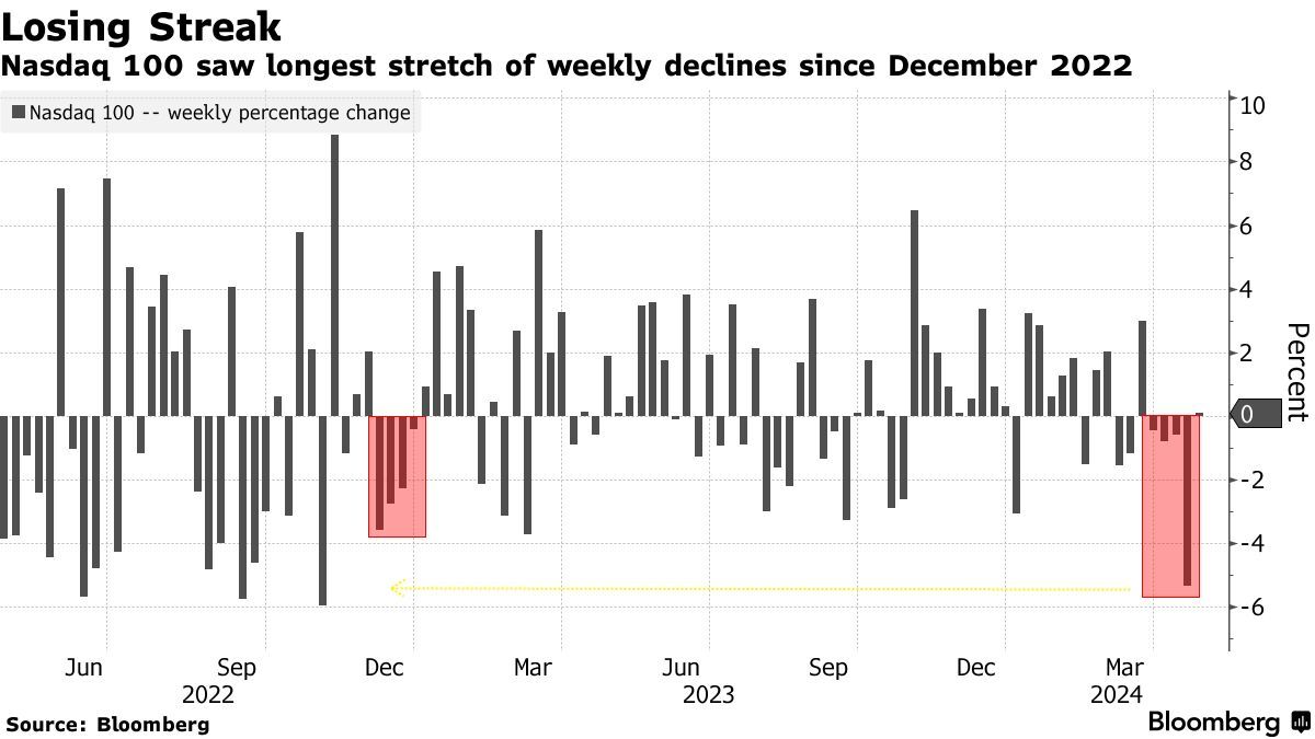 Marko Kolanovic表示,尽管美国企业本周公布的业绩可能会暂时稳定市场,但这并不意味着股市已经脱离困境。他认为,对股市估值的自满情绪、通胀居高不下、对美联储降息预期的减弱、以及对盈利前景过于乐观这些因素都加剧了股市的下行风险。他在给客户的一份报告中指出:“股市回调可能还会继续。市场集中度非常高、仓位扩大,这通常是危险信号,有逆转的风险。”市场回调通常被定义为下跌10%或以上。数据显示,标普500指数上周收盘时较3月28日的收盘高点下跌了超过5%。