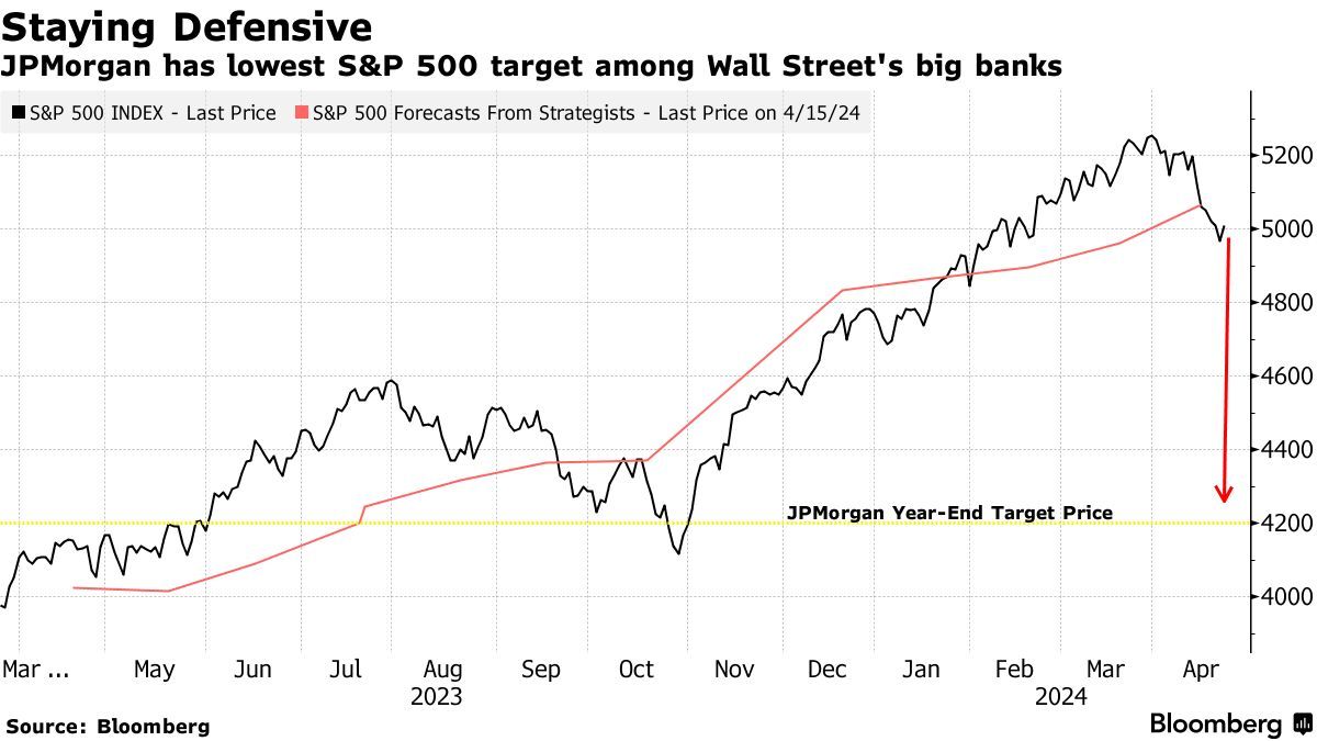 Marko Kolanovic及其团队是今年华尔街少数看跌的反向投资者之一。在多数同行调高对美股的预期之际,这些摩根大通策略师仍普遍不看好股票和风险资产,其对标普500指数在2024年底的预期为4200点,是华尔街大型银行中最低的。这一预期点位意味着,标普500指数到年底将较周一收盘水平跌去约16%。
