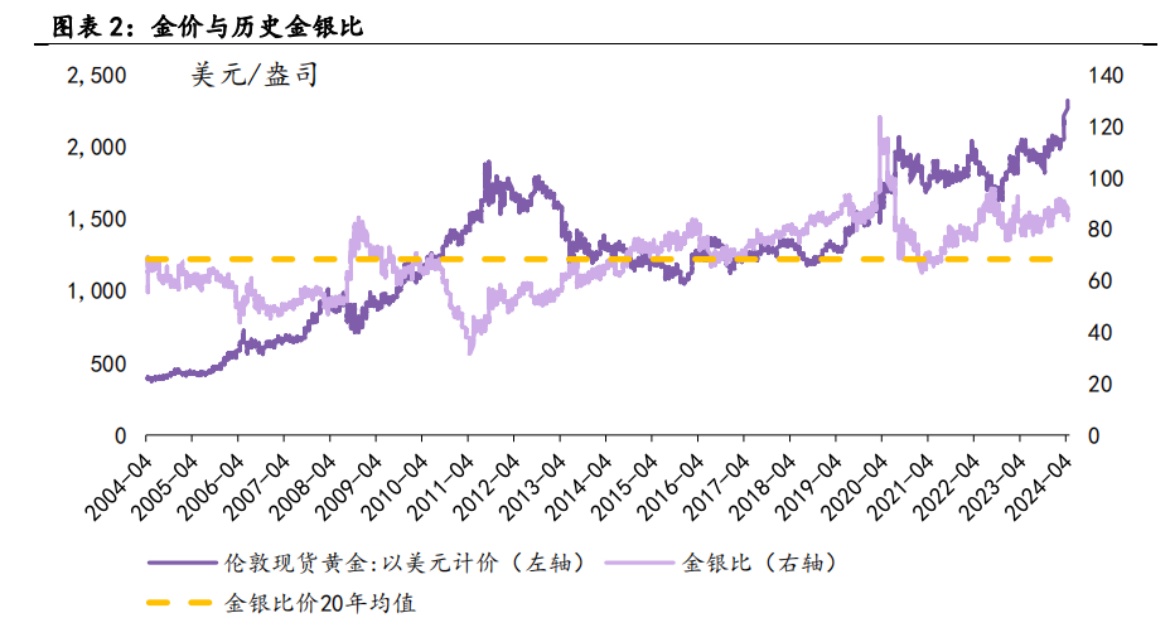 在金价持续上涨后,当前金银比价处于历史高位,最近20年金银比均值为68.3,而目前金银比已超过83.4。远超历史均值的金银比,也让白银配置变得越来越具有性价比。