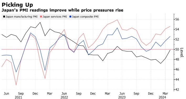 智通财经获悉,衡量日本制造业和服务业活动的关键指标4月份有所改善,达到近一年来的最高水平,尽管日元走软加剧了企业面临的价格压力,这表明它们对通胀的容忍度正在提高。标准普尔全球周二报告称,日本4月Jibun综合PMI初值升至52.6,为去年8月以来的最高水平。日本4月Jibun制造业和服务业PMI分别升至49.9和54.6,为去年5月以来的最高水平。该指数高于50表明经济处于扩张状态。
