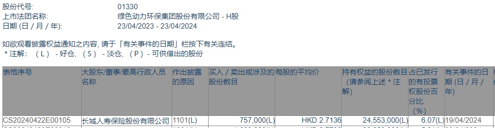 智通财经APP获悉,香港联交所最新资料显示,4月19日,长城人寿保险增持绿色动力环保(01330)75.7万股,每股作价2.7136港元,总金额约为205.42万港元。增持后最新持股数目为2455.3万股,最新持股比例为6.07%。