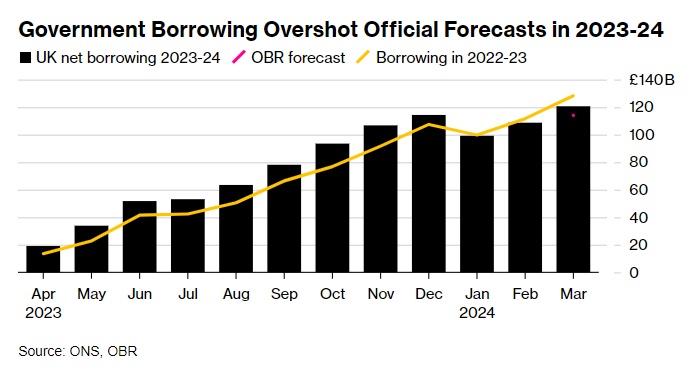 智通财经APP获悉,上一财政年度,英国政府的借款超过了官方预测,突显出财政大臣杰里米•亨特在大选前寻求减税之际所面临的限制。