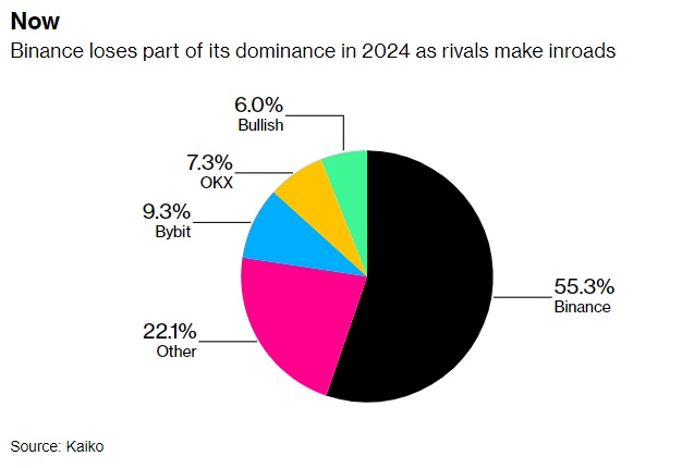 根据研究公司Kaiko的数据,在过去的一年里,全球最大的加密货币交易所币安在比特币交易中的份额从81.3%降至55.3%。对于较小的代币,即山寨币,这一比例从58%降至50.5%。