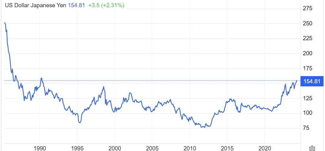 日本上一次干预外汇市场是在2022年,当时首次发生在9月,第二次是发生在10月,目的在于支撑但是极度疲软的日元,但是当前美元兑日元已超过日本央行2022年干预外汇之时的点位。日元汇率(美元兑日元)在周二一度触及1美元兑154.863日元,全面超过了日本财务省在2022年大举买入日元时一度触及的151.95日元这一点位数值。
